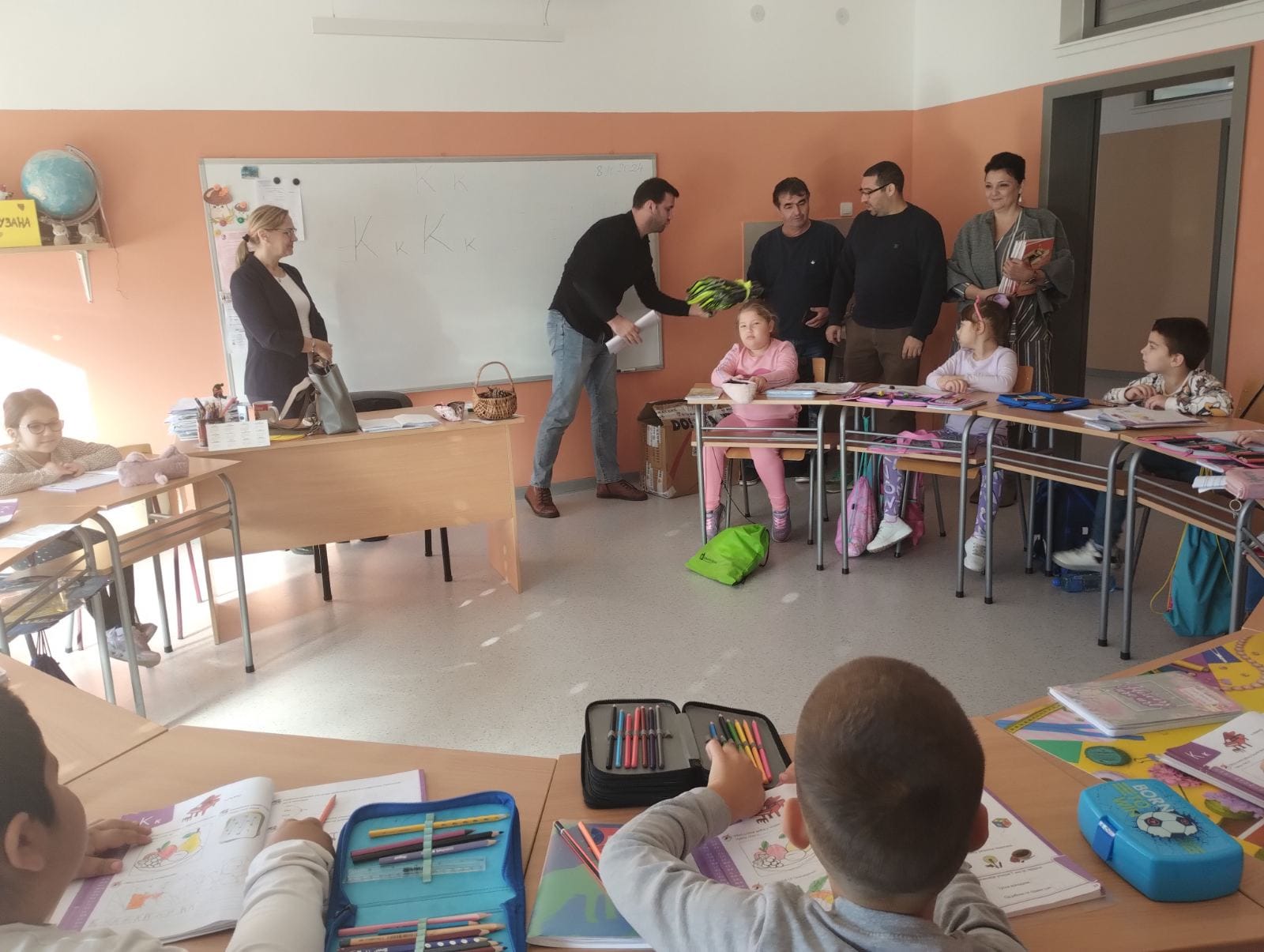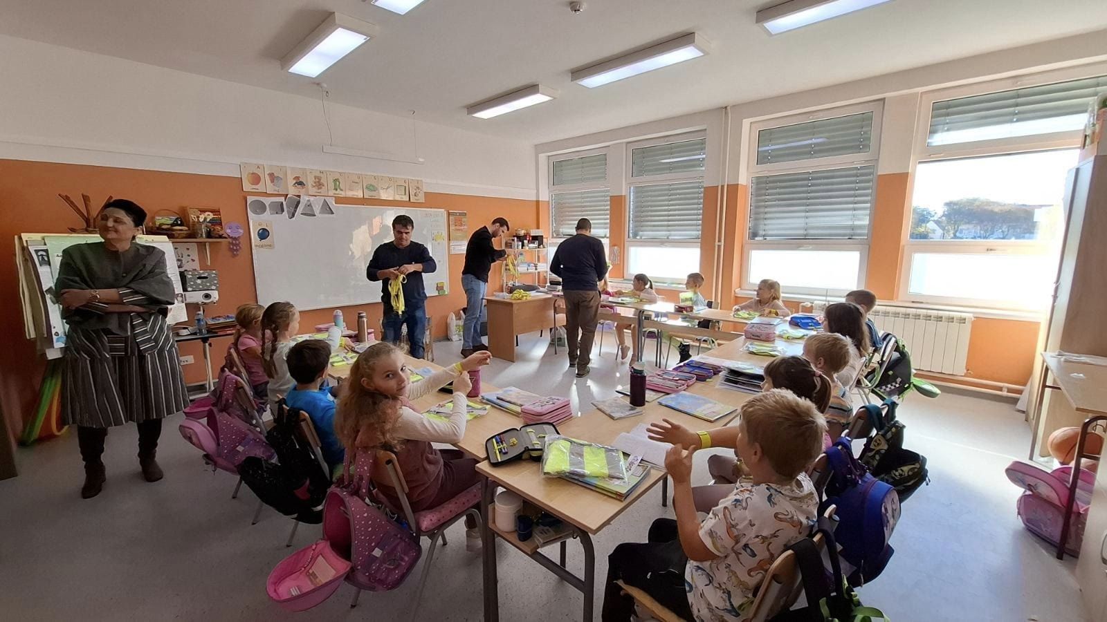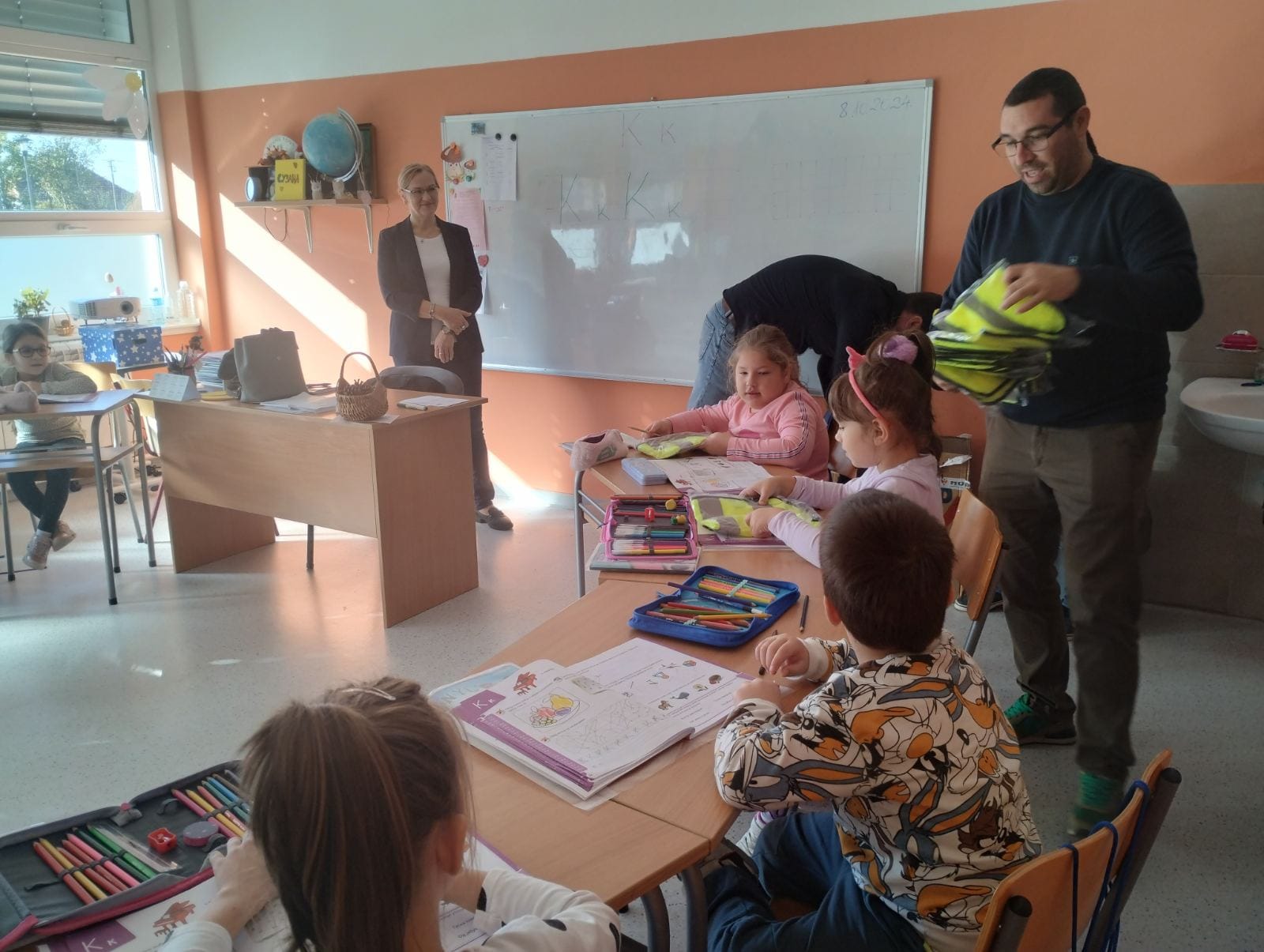 Csóka község önkormányzatának közlekedésbiztonsági képviselői ma, 2024. október 8-án meglátogatták az első osztályos tanulókat, akiknek mellényeket és karkötőket adtak át.