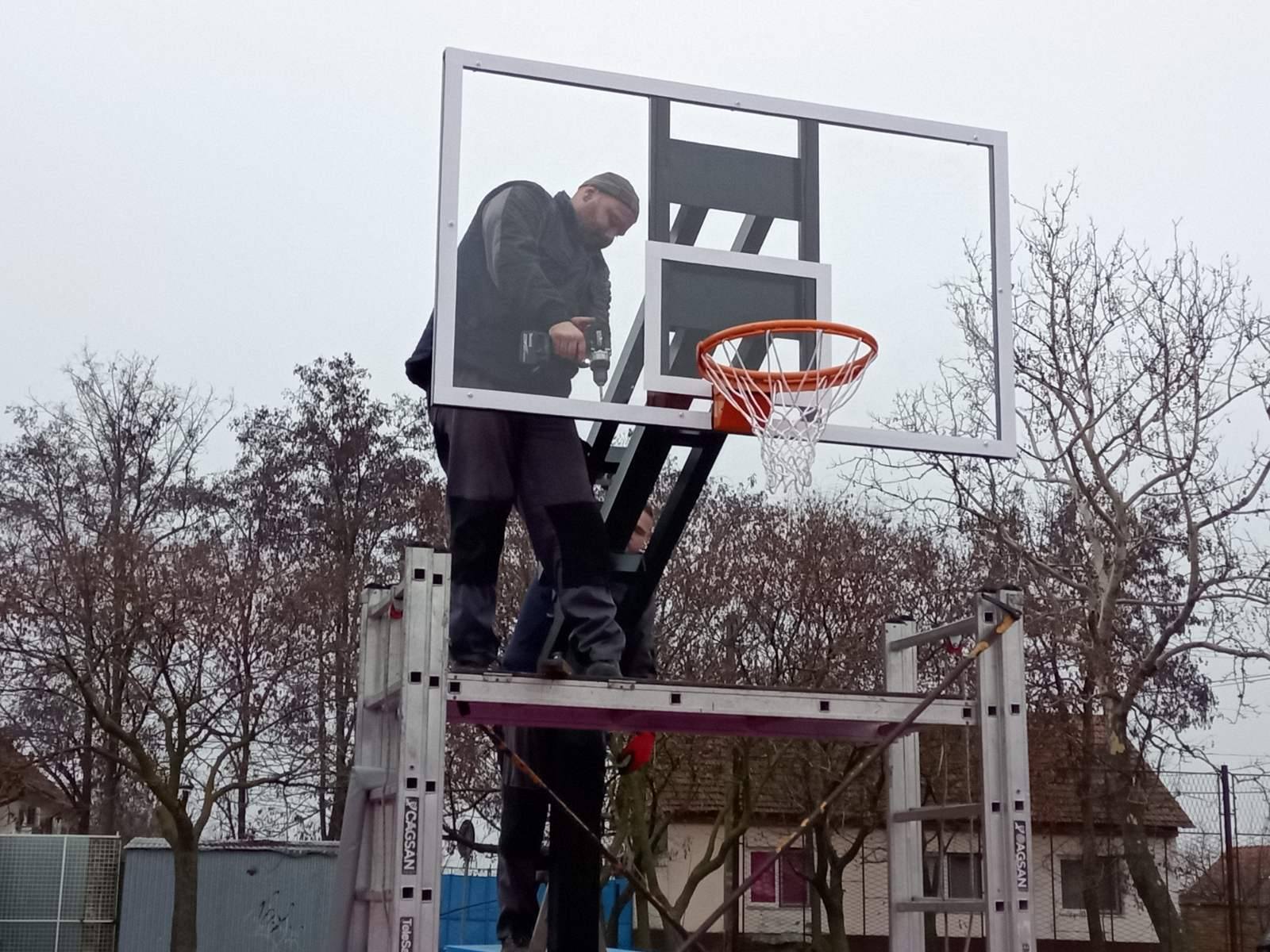A fotók a munka menetét mutatják be, a régi palánkok szétszerelésétől az új palánkok rögzítéséig. Az új pálya új sportg
