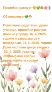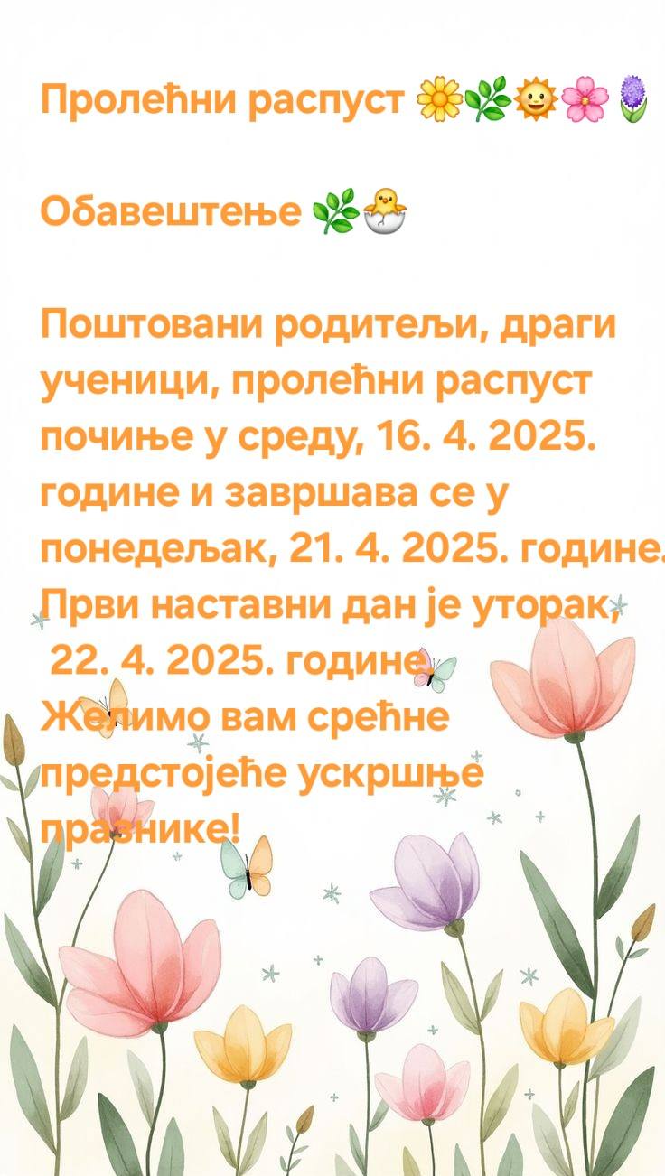 Поштовани родитељи, драги ученици, пролећни распуст почиње у среду, 16. 4. 2025. године и завршава се у понедељак, 21. 4. 2025. године. Први наставни дан је уторак, 22. 4. 2025. године.
