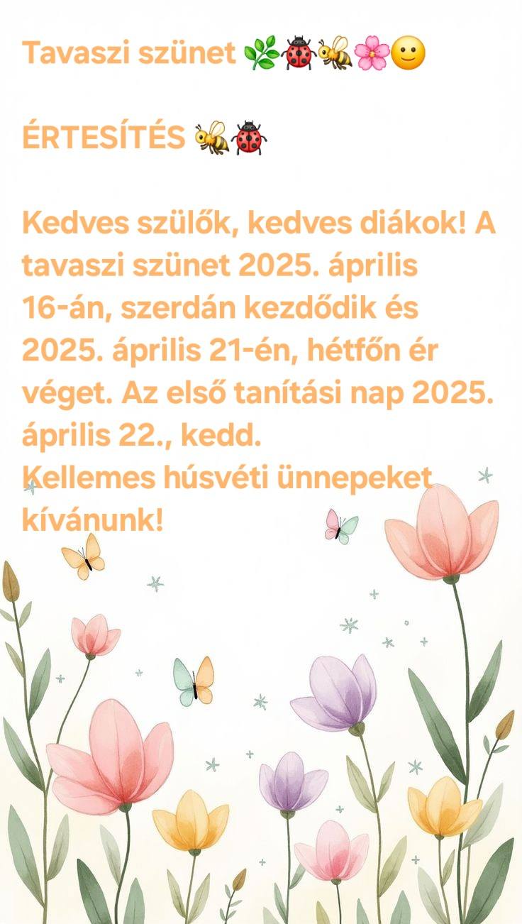 Kedves szülők, kedves diákok! A tavaszi szünet 2025. április 16-án, szerdán kezdődik és 2025. április 21-én, hétfőn ér véget. Az első tanítási nap 2025. április 22., kedd.