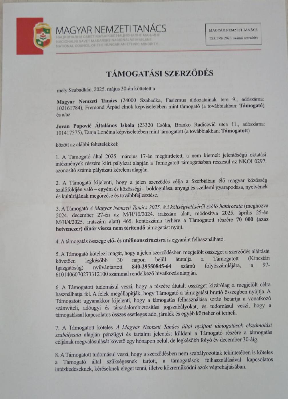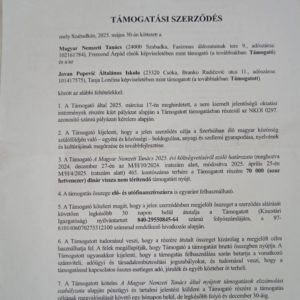 Тања Лончина, директорица наше школе, присуствовала је потписивању уговора за добијени конкурс који је расписао Национални савет мађарске националне мањине за 2025. годину. Потписивање уговора уприличено је у петак, 30. 5. 2025. године на Учитељском факултету на мађарском наставном језику. Школа је добила 70 000 динара. Овим путем се захваљуемо!